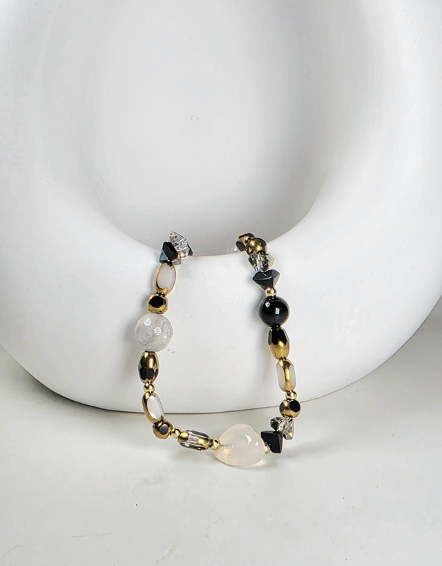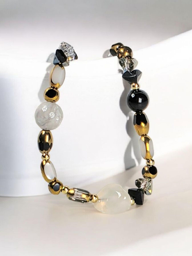 Zeitlose Eleganz trifft auf feine Handarbeit – dieses Armband vereint klassische Schwarz-Weiß-Kontraste mit einem Hauch von luxuriösem Gold.