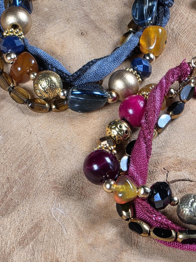 Materialien: vergoldeter Edelstahl, Glas- und Facettenperlen, Edelsteine, Textilband