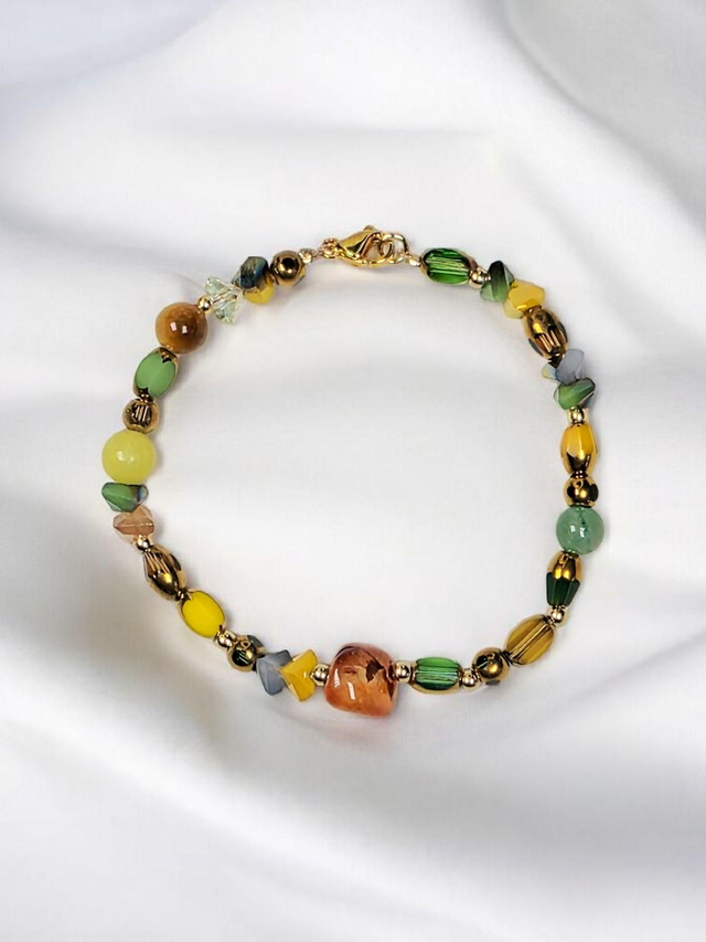 Die Kombination aus Achat, Zitronenjade, Aventurin und funkelnden Kristallperlen erinnert an die warmen Töne der Erde und das sanfte Schimmern des Lichts.