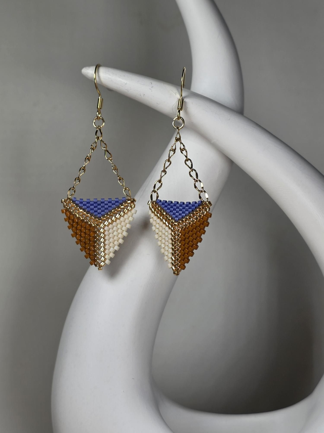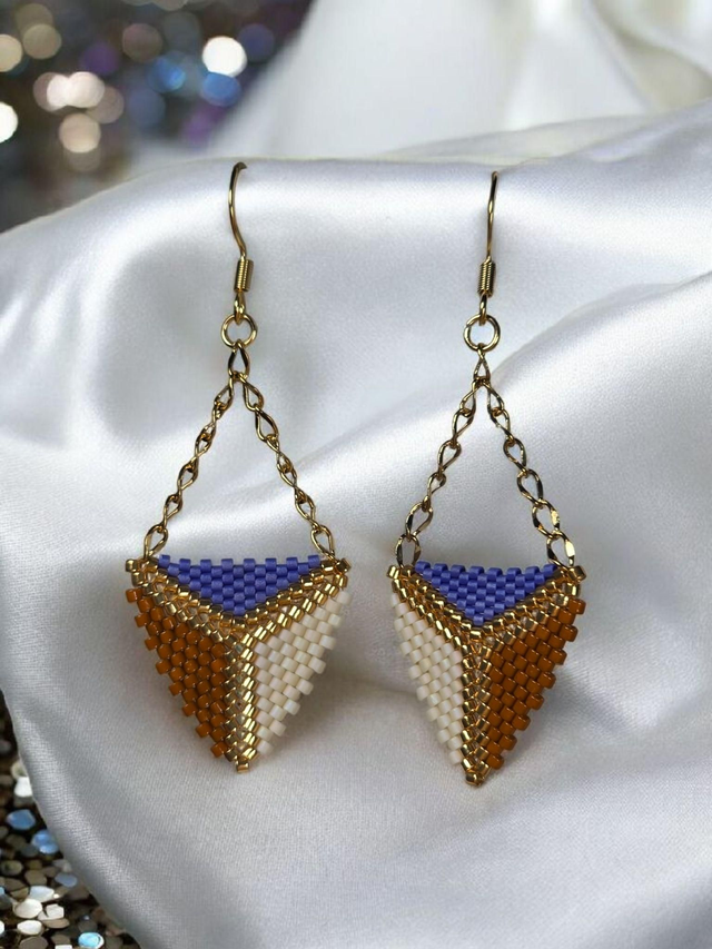 Ein Meisterwerk aus filigranen Miyuki Delica-Perlen (11/0) in Blau, Weiß und Gold-Braun, kombiniert mit hochwertigen vergoldeten Edelstahl-Elementen.
