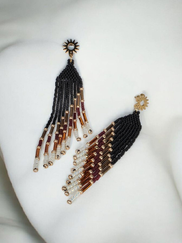 Der vergoldete Edelstahl-Stecker in Form einer Sonne verleiht ihnen einen strahlenden, modernen Charakter, während die filigranen Miyuki-Perlen in tiefem Schwarz, warmem Gold, zartem Weiß und einem Hauch Bordeaux harmonisch miteinander verschmelzen.